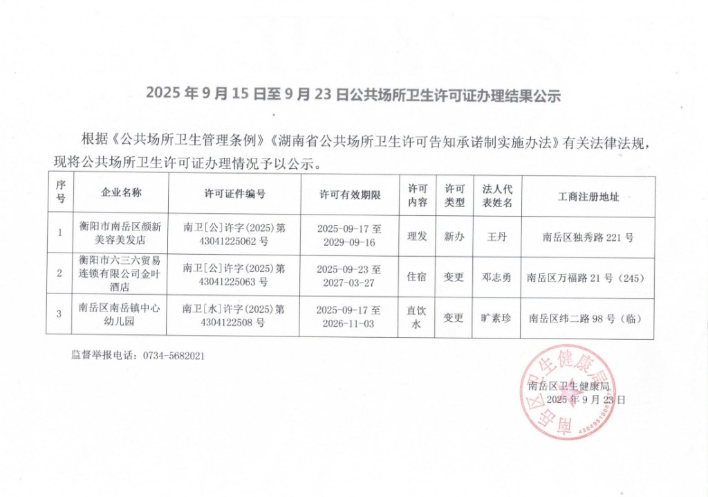 2025年9月15日至9月23日公共场所卫生许可证办理结果公示